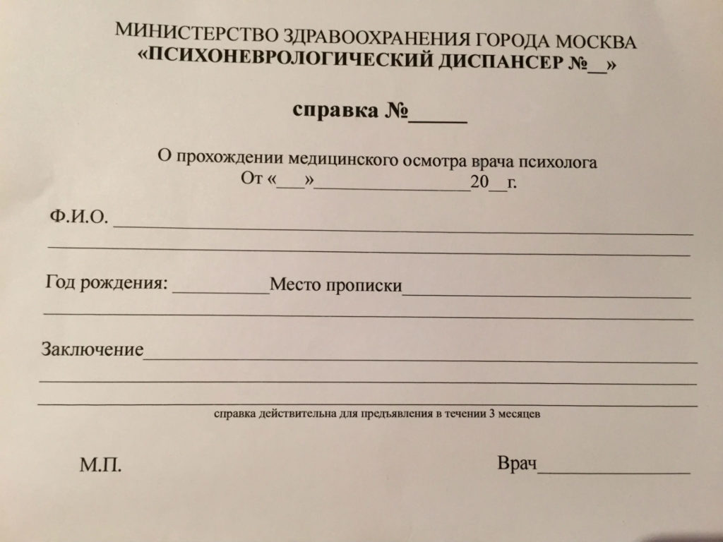 Освидетельствование в ПНД — платная услуга, она не покрывается медицинской страховкой. Даже при самостоятельном получении документа, нужно будет взять с собой гражданский паспорт, полис и квитанцию об оплате. Но это все равно не отменяет необходимости заранее отпрашиваться с работы, записываться к врачу, стоять в очереди и т.д. Можно заказать справку в нашем центре. Цена справки с психоневрологического диспансера у нас — 1200 рублей. И при этом вы экономите время и силы, которые ушли бы на бюрократические формальности.